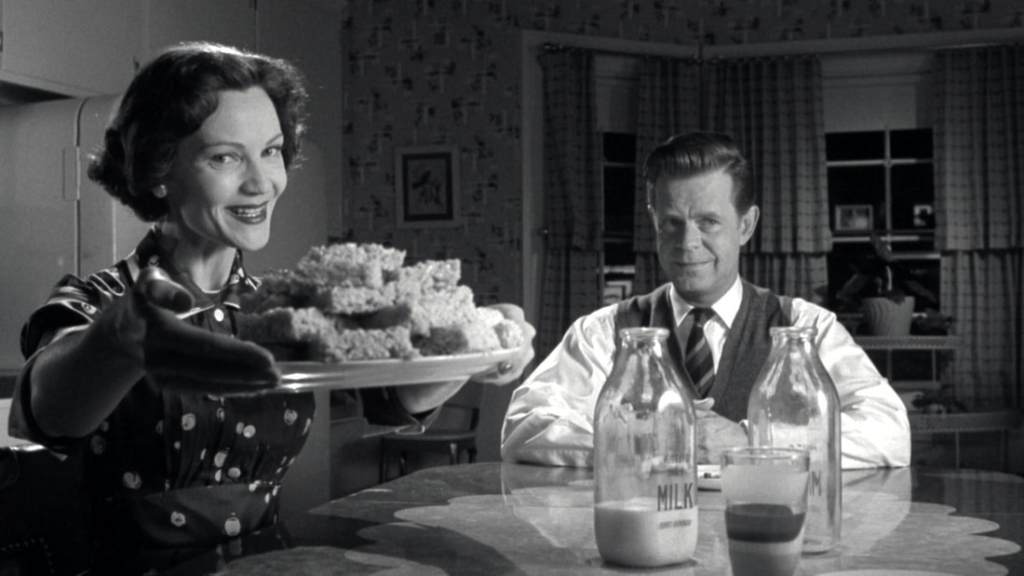 Lo que empieza siendo una típica comedia de adolescentes y hormoneo se transforma entonces en una historia de fantasía. Los dos hermanos llegan desde un mundo complejo, coloreado y demasiado grande y problemático a una realidad monocroma, donde todo es correcto y agradable pero muy limitado. No hay nada fuera de Pleasantville, no existen los errores, ni la enfermedad, ni el pasado ni el futuro… La película es el relato, divertido y bien construido, sobre la llegada del “color” y lo que este significa, a la vida de los habitantes del pueblo ficticio. Ya no diré más del argumento, para no destripar.